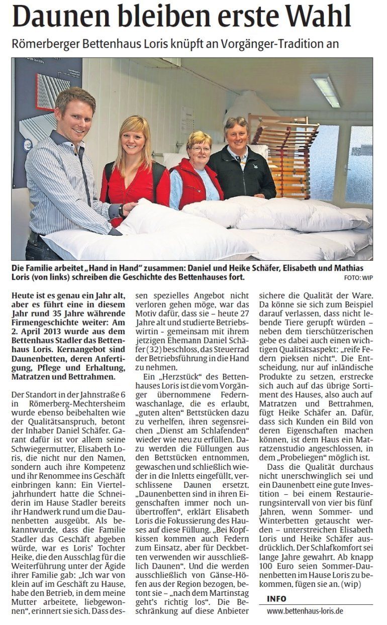Am 02. April 2013 eröffnete das ehemalige Betten Stadler unter dem neuen Namen Bettenhaus Loris seine Türen. Nach 35 jährigem Bestehen übernahmen Elisabeth Loris mit Heike und Daniel Schäfer die Führung des Bettenhauses.